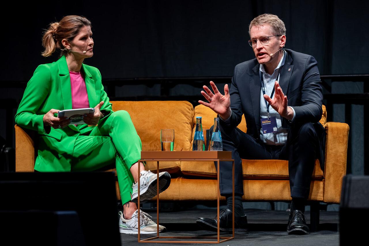 Eine knappe Stunde Couchgespräch mit Schleswig-Holsteins Ministerpräsident Daniel Günther vor 600 Experten zum Thema „erneuerbare Energien“ – Challenge accepted – Powernet Neumünster 2026 – so viel gute Energie – nicht nur mit den Ministern auf der Bühne.